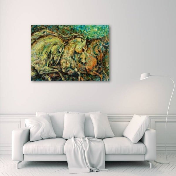 "Compás del Viento" — tres siluetas que encarnan la libertad, la fuerza y el ritmo del sur de España. Caballos en carrera, almas que galopan al compás del viento. Obra de la colección "Colores del Alma Sevillana", creada especialmente para la exposición en Sevilla, celebrada del 5 al 11 de mayo de 2025.